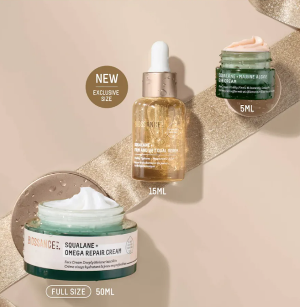 Biossance套裝有齊三件皇牌產品,包括Omega 修護面霜、緊緻提升雙效精華和海藻眼霜。產品主打親膚性極佳的角鯊烷 (Squalane),能深層保濕、修復肌膚屏障,使肌膚更緊緻飽滿,全面提亮膚色。
