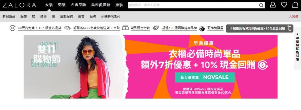提供免費退換貨服務的時裝網購平台ZALORA,由11月2日至11月15日起推出「雙11購物節」限時優惠活動!人氣時裝牌都有折扣優惠低至2折,!此外,購物指定產品滿HK$450,輸入優惠碼﹕NOVSALE,更可享有額外7折優惠,和10%現金回贈!