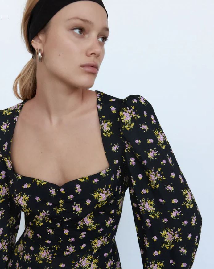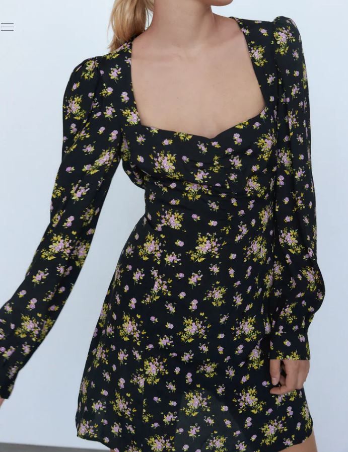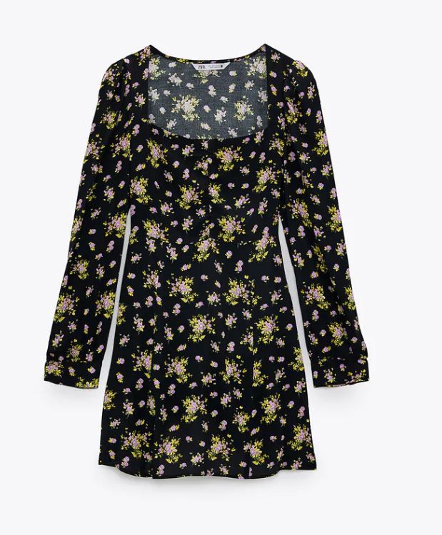 碎花圖案迷你連身裙,秋冬搭配深色系外套也不顯單調。心形領口配上明顯墊肩設計,充滿復古風格。側身配隱藏式拉鍊,方便穿著。