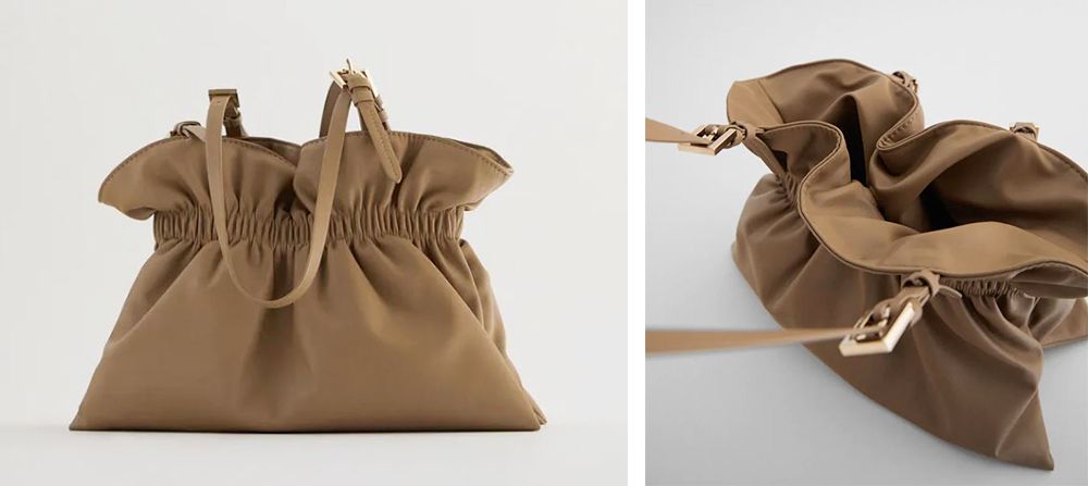 柔和奶茶棕色縮褶水桶袋,配有可調式肩背帶配金屬卡扣,內部配拉鍊口袋,收納量充足,無論是返工或是約會使用也合適。