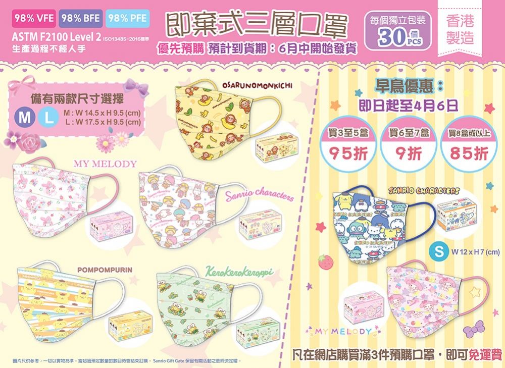 最近,香港官方網店Sanrio再次推出新款印花口罩,今次款式除了有經典角色My Melody、Little Twin Stars外,就連可愛活潑的馬騮仔、Keroppi和布甸狗都有加入。口罩配有大/中/小尺碼可供選擇,無論大人還是小孩都適用。另外,現在只要在Sanrio官方網店預購,更可享早鳥優惠,最平$85/30個,平均HK$2.8就能買到,Sanrio粉絲不要錯過了!