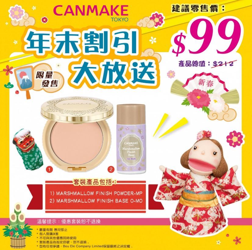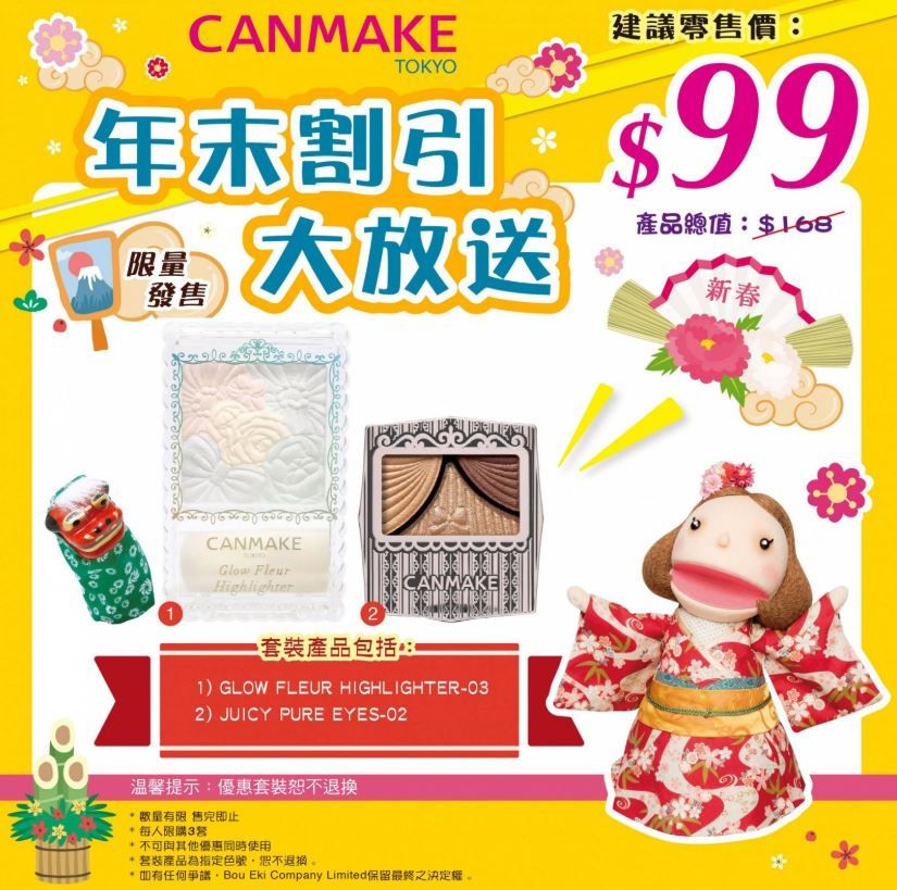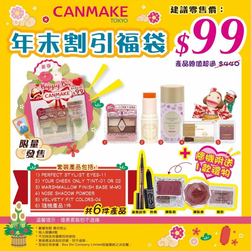 除了眼影有優惠之外,CANMAKE更推出了年末的福袋組合,只需要港幣99就可以獲得不同彩妝組合!像是眼部打底霜、香水、護手霜等。