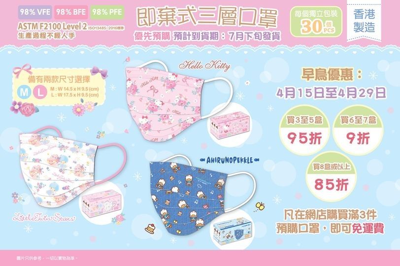 由即日起至4月29日,更可享優先預購早鳥優惠,凡購買滿3盒或以上預購口罩可免運費。購買3 - 5盒享95折;買6-7盒享9折;8盒或以上更可享85折優惠,口罩最平$85/30個,平均HK$2.8便買到。預購口罩預計在七月下旬到貨,喜歡Sanrio Characters的朋友便不要錯過這次早鳥優惠!>>>按此預購<<<