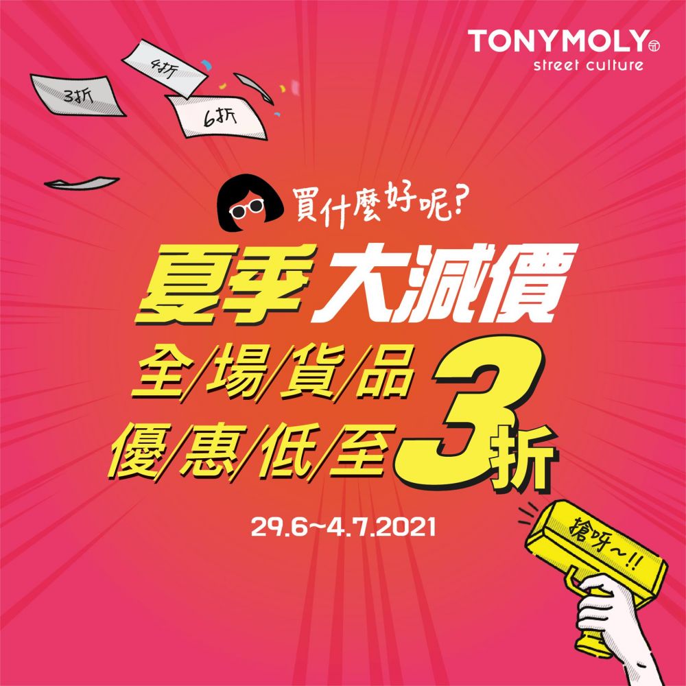 TONYMOLY夏季大減價全場低至3折!TONYMOLY大量夏天必備護膚品、防曬、身體護理、彩妝產品都有超抵折扣,一起到TONYMOLY門市搶購精選產品迎接夏日!減價活動由6月29日至7月4日香港TONYMOLY全線分店舉行,人氣產品蝸牛全效修護系列、蘆薈舒緩保濕啫喱等等都有優惠!