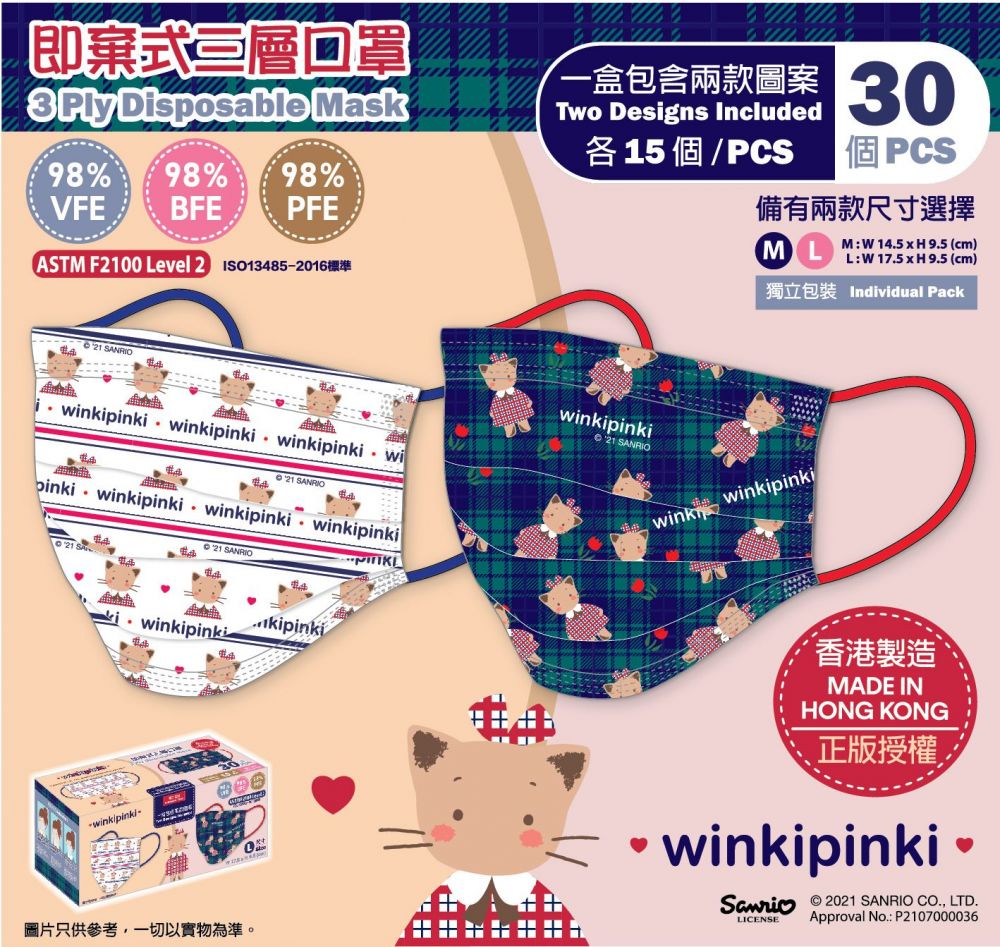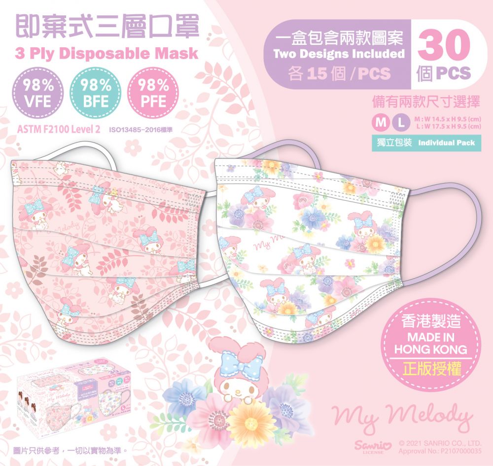 三層口罩採用熔噴布製成,細菌過濾效率(BFE)、微粒過濾效率(PFE)及病毒過濾率(VFE)≥98%,達到ASTM F2100 Level 2級別,而且100%香港製造,用起來安心又可靠!口罩分為M(145 X 95mm)及L(175 X 95mm)兩個尺碼,每個獨立包裝,一盒30個入,一盒口罩有兩款不同卡通圖案。