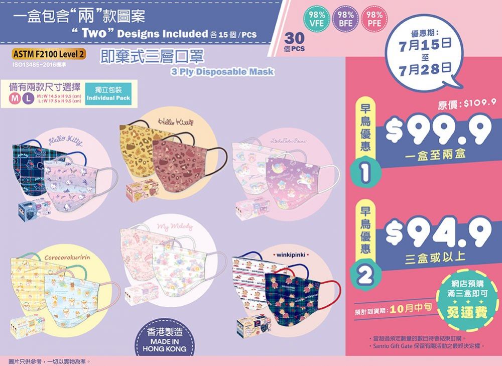 由即日起至7月28日,只要在Sanrio官方網店購買預購口罩,更可享獨家早鳥優惠,購買1-2盒口罩即享優惠價HK$99.9/30個入;買3盒或以上享HK$94.9/30個入,凡買滿3件更可享免運費優惠,非常抵買!>>>按此預購<<<