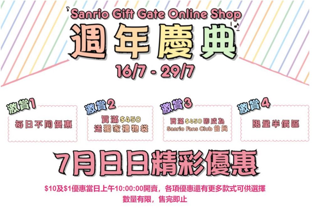 Sanrio官網現在正進行週年慶典優惠,每日都有不同的優惠,多款商品更低至5折,手袋、睡衣、各種生活用品都有,最平$16就買到,買滿$450再送獨家禮物袋,Sanrio粉絲們不要錯過!