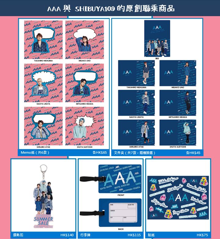 日本人氣組合AAA今年不只擔任日本及香港SHIBUYA109 Summer Sale宣傳大使,AAA的期間限定POPUP STORE將於8月3日起在SHIBUYA109海港城店開幕!店內除有售賣 SHIBUYA109和AAA的原創聯乘商品、AAA 官方周邊商品之外,亦會播放AAA的演唱會片段。