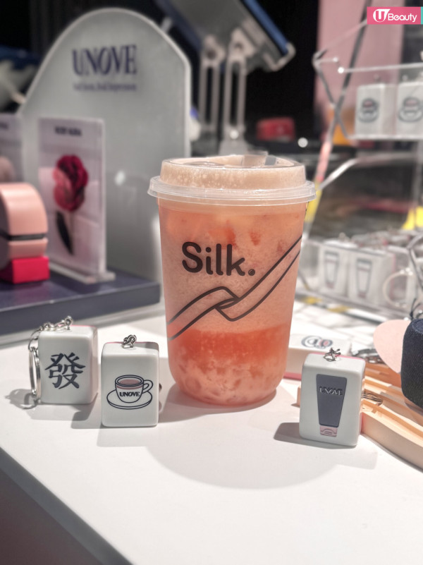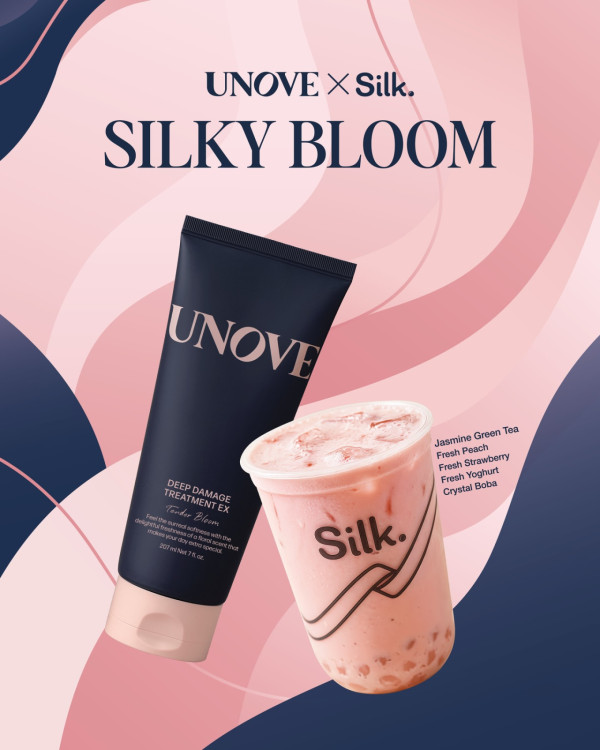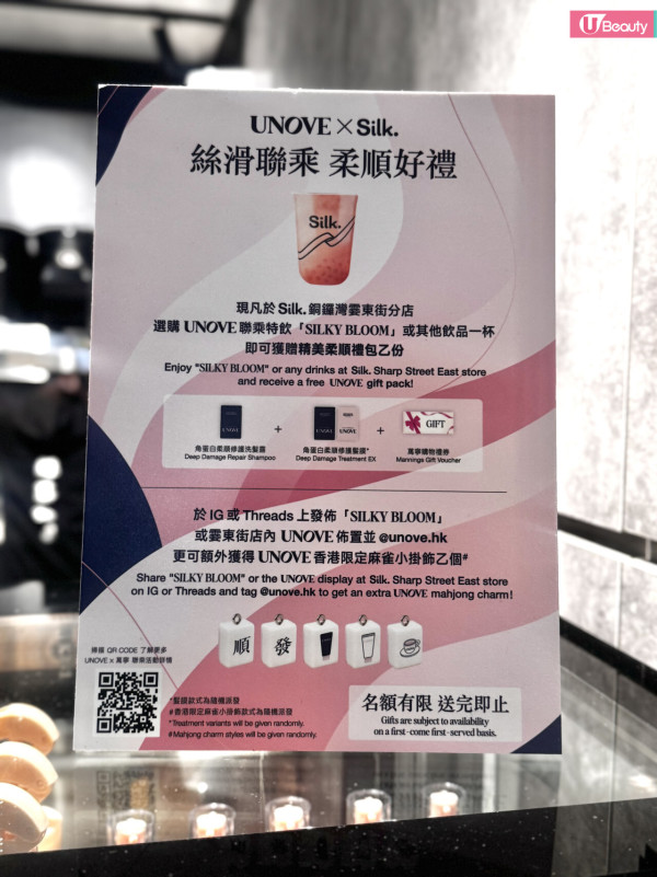 購買一杯「SILKY BLOOM」或其他飲品,即送 UNOVE 精美柔順禮包(內含深層修復洗髮露 + 護髮膜 + 萬寧現金券)。