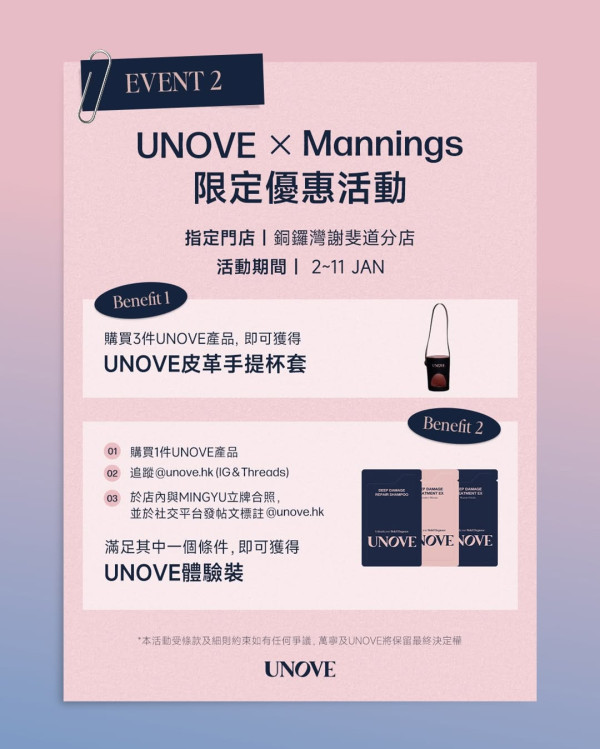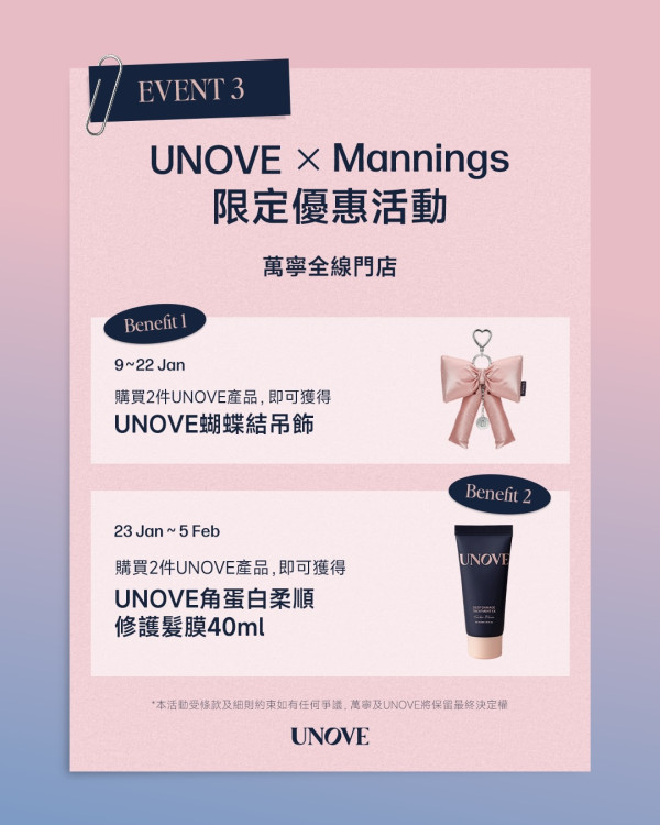 第二彈(23/1- 5/2):購買任何 2 件 UNOVE 產品,即送 UNOVE 角蛋白柔順修護髮膜 40ml。