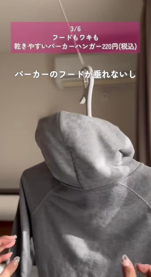 這款絕對是 DAISO 的皇牌產品!平時晾 Hoodie 最崩潰就是帽子和腋下位置永遠乾不透。獨特立體架設計, 可以將衛衣的帽子「夾」起來,不再垂在背後,讓帽子內部通風。腋下撐開設計,兩側臂架能將衣袖撐開,讓最難乾的腋下位置形成「通風隧道」。 掛鉤位可旋轉,隨風轉動加速乾燥,從此告別「半乾濕」臭味!