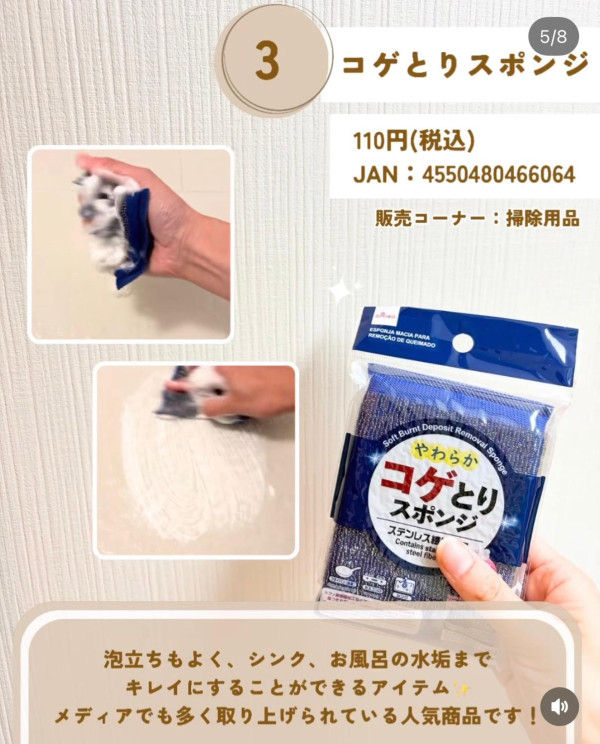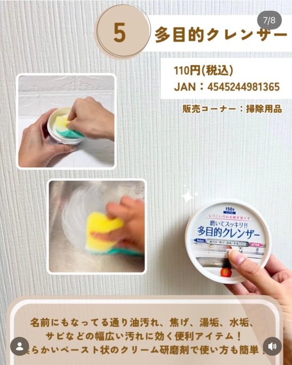 這款被譽為 DAISO「鎮店之寶」的多功能清潔膏,經常賣到斷貨!它雖然是研磨劑,但質地相當細膩,由廚房油污、鍋底焦痕到浴室水垢、甚至鐵鏽都能一罐搞掂。用法非常簡單,只需用海綿或保鮮膜沾取少量膏體,在污漬表面打圈擦拭,金屬表面隨即回復鏡面光澤,效果像新的一樣,一罐 150g 可以用很久,CP 值極高。