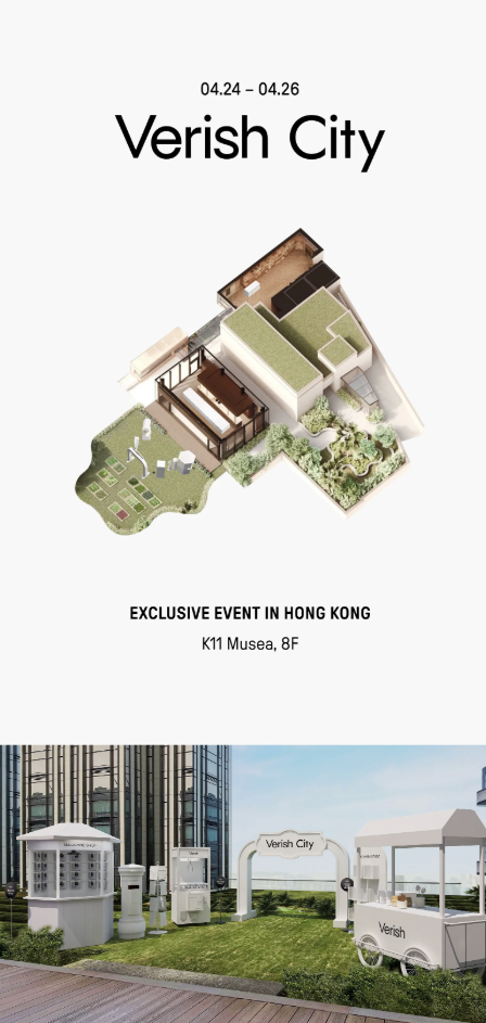 除了購物,Verish 特別在 K11 MUSEA 8 樓打造了一個名為 "Verish City" 的夢幻空間,這是一個採預約制的專屬體驗活動,把場地佈置成純白優雅的露天市集風格,結合了互動裝置與戶外美景,有多個打卡位、互動設施等,現場還提供精心準備的飲品與小食以及活動限定的驚喜獎勵。