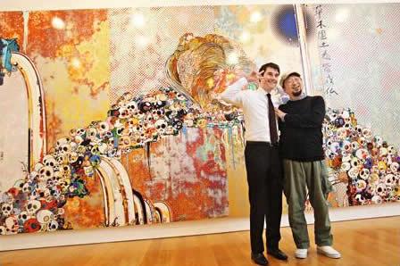 村上隆與高古軒香港畫廊總監 Nick Simunovic 在作品《Of Chinese Lions, Peonies, Skulls, And Fountains, 2011》前。