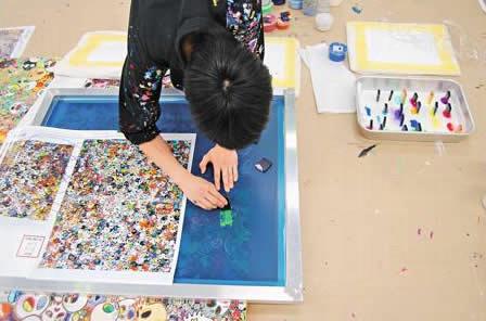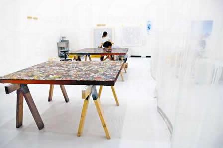 談到畫的內容與 structure 的關係,村上隆頓時收起頑皮的表情,認真地說:「今次把小花與骷髏頭拼在一起,骷髏頭本是代表死亡,但彩色的骷髏卻又不盡是完全絕望 —— 我們會死,但現在卻活着。小花與骷髏,看似是相反,又似是相同。對於這種既相配又矛盾的概念,需要獨特的繪畫技巧配合。花朵笑意盈盈,有凸顯的感覺,我必須畫到那種突出的效果,而陰沉的骷髏頭造型只有眼窩和鼻孔,它們感覺深沉,須呈現一種『陷入』的效果。花兒與骷髏,一凹一凸,一高一低,兩者在結構方面產生強烈的比對效果,這也是最具挑戰性的地方。」
