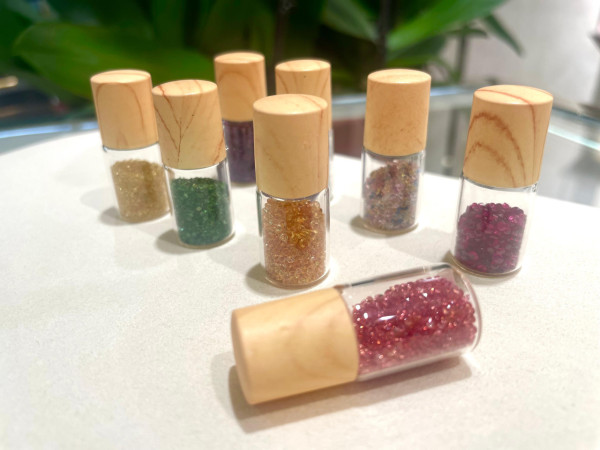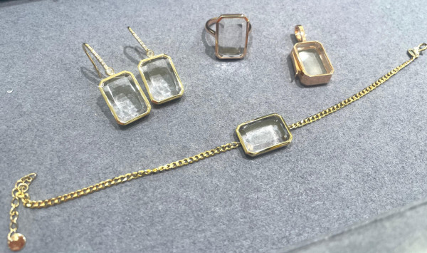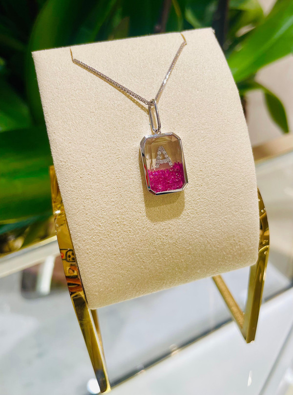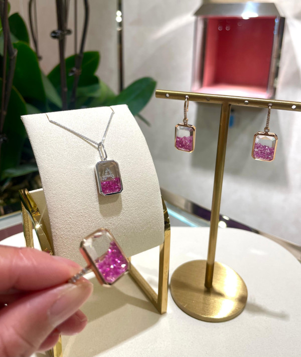 見朋友戴了一款像是透明錶肉的鏈咀,有她名字的A字,鏈咀內更有粉紅色的碎石,攞動時碎石會流動。她的耳環是同款,但碎石是不同顏色。