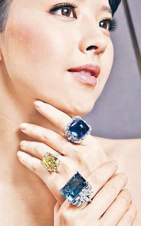 上至下:Royal Gardens 系列鉑金鑽石戒指主石重 65.68 卡 $25,760,000、黃鑽鉑金戒指主石重 28.48 卡 $77,280,000、海藍寶鑽石戒指主石重 59.55 卡 $2,024,000。