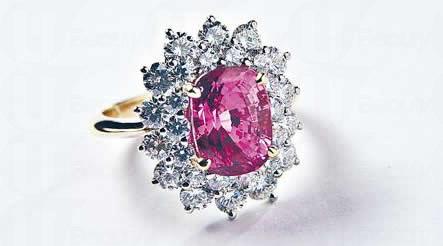 枕形粉紅藍寶石鑽石戒指主石重 4.7 卡、綴以 28 顆鑽石共重 2.05 卡 $588,800。