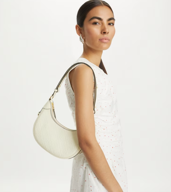 Tory Burch 的 T Monogram 系列以經典的雙 T 圖案為特色,這款 Crescent Bag 將標誌性圖案壓印在光滑的意大利皮革上,將經典圖騰與流行包型完美結合,更以一種更為低調、精緻的方式展現了品牌標識,是 subtle logomania(低調Logo風)的完美演繹呈現出低調而優雅的質感 。其簡潔的新月造型完美貼合腋下,是日常配搭的理想之選。