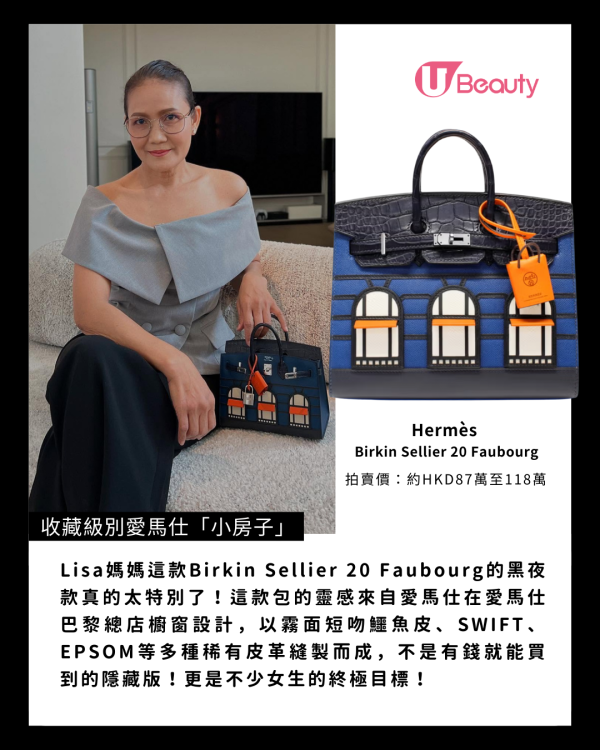 Lisa在IG上曬出的愛馬仕手袋是「Faubourg Birkin」系列,該系列是以Hermès 巴黎總店 Faubourg Saint-Honoré 街景為設計靈感,一共推出了Day、Night、Midnight、Snow、Rainy Days、Sunset Glow,共6個不同天氣款式,Lisa手上的是Night版本的手袋,拼色設計採用海軍藍(Bleu Marine)霧面短吻鱷魚皮、深藍色(Deep Blue)Madame 小牛皮為主,在蘇富比拍賣行上最高曾以150萬美元(約HK$1,169,865港元)成交,絕對是收藏級別的愛馬仕手袋!