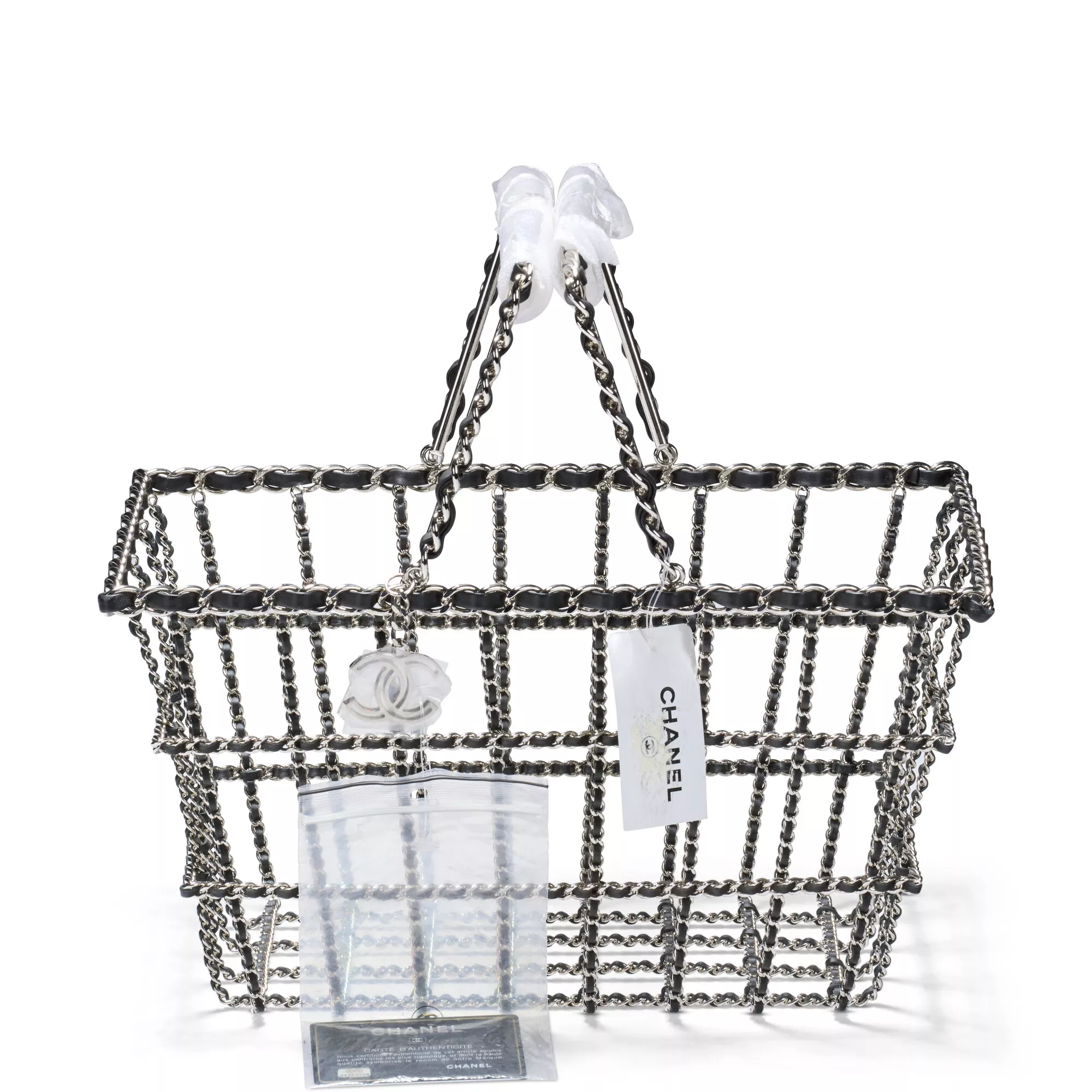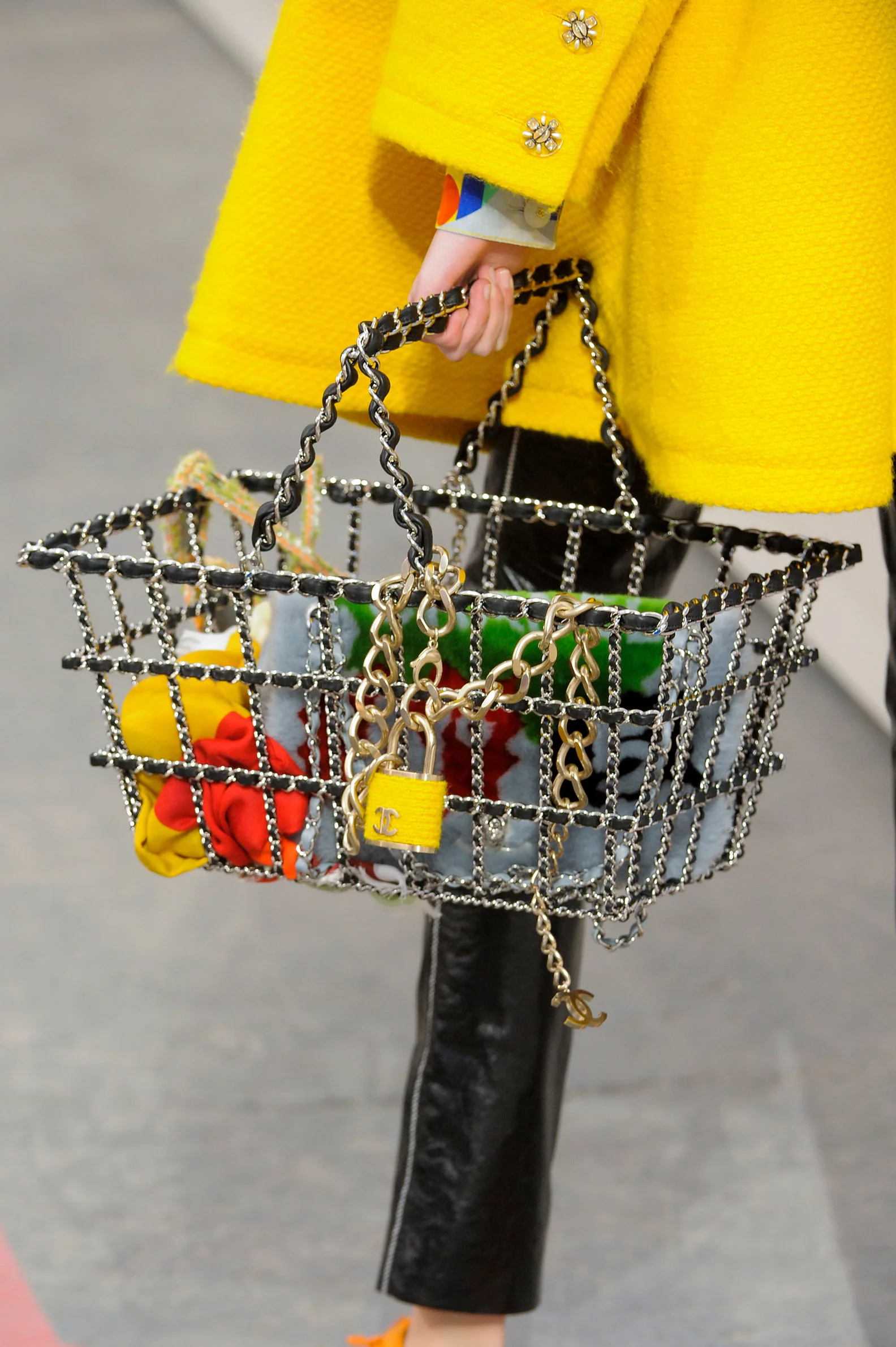 當年由老佛爺 Karl Lagerfeld 所設計的 Chanel 2014 秋冬女裝系列可謂令人難忘,當中最為人津津樂道的,莫過於品牌於時裝秀中,將巴黎大皇宮改造成一座購物中心「CHANEL Shopping Center」,然而數到最受矚目的作品,非由金屬鍊條編織而成的購物籃莫屬,可見 Karl Lagerfeld 將幽默感發揮到極致。