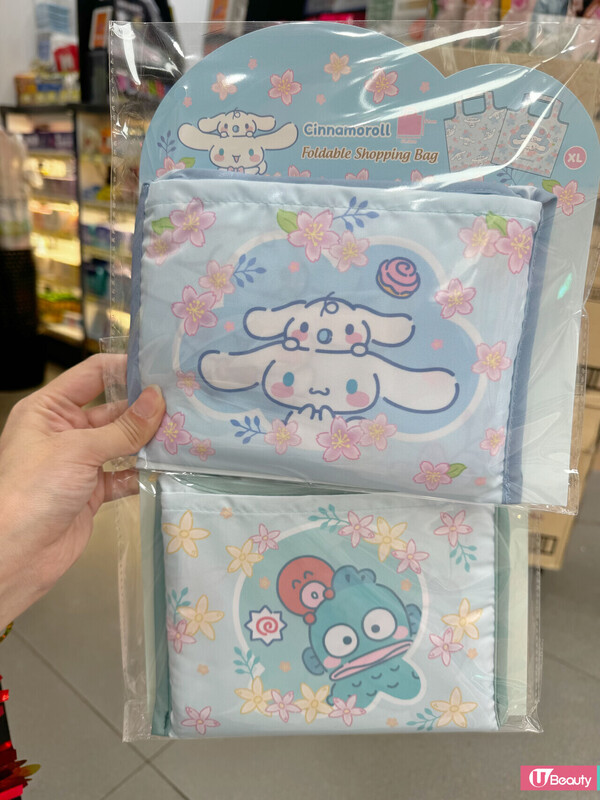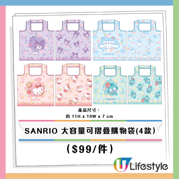 喜歡輕便外出的你就不可缺少一個可摺疊購物袋($99/件)。這款購物袋設計出日系櫻花風格,分別有4款角色Hello Kitty、Kuromi、Cinnamoroll和水怪。質地輕巧,容量充足,方便收納於手袋中,無論是超市掃貨還是隨身備用都適合。
