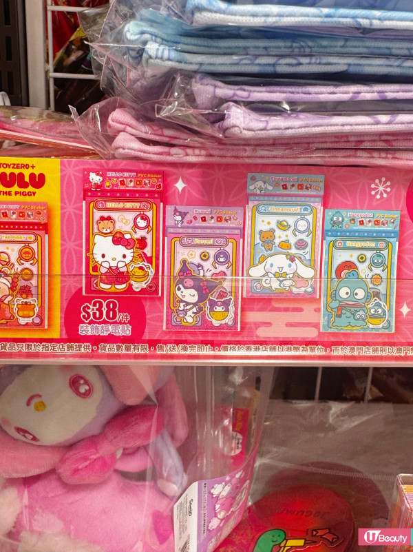 此外,還有Y2K風格的Sanrio透明斜揹袋(港幣 $129/件),融入了流行的「痛袋」元素,正面設有Cinnamoroll、水怪等戴上招財貓頭飾的設計,而背面則印有大型日式吉祥物圖案,充滿可愛感 。裝飾靜電貼(港幣 $38/件)則每套含 12 款貼紙,可隨意組合專屬的幸運夾公仔機造型。