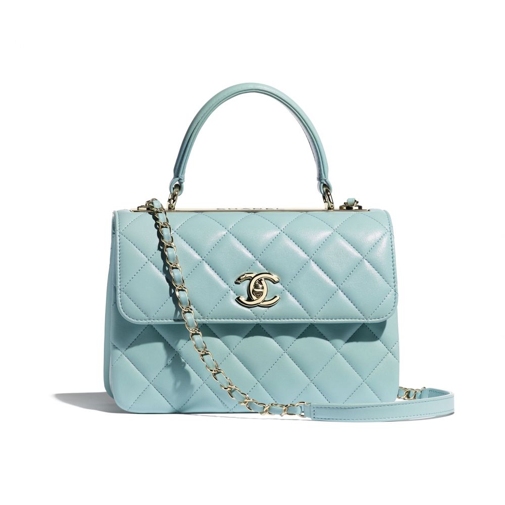 細號手挽垂蓋手袋,以軟軟的小羊皮製成。用上超美的復古淺藍色、Coco Chanel女士鍾情的菱格紋,相信會成為CHANEL粉絲的命定收藏款式。