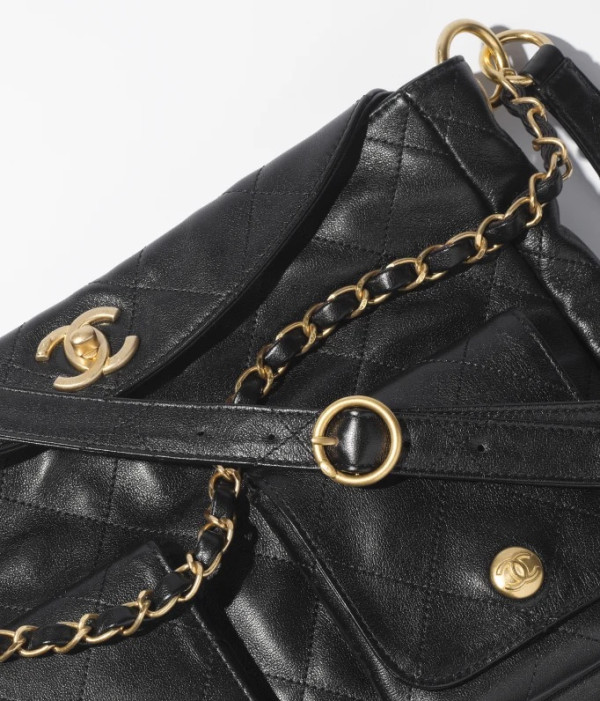 CHANEL 24P Hobo大型流浪手袋在設計上與CHANEL 24S Hobo的外觀大相逕庭,展現出更突出的設計感。 這款腋下托特手袋使用了亮面小牛皮材質,表面增添了兩個實用的口袋,提升了手袋的功能性與時尚感。 經典的雙C logo巧妙地安置在微翻蓋之上,增添了品牌的標誌性元素。