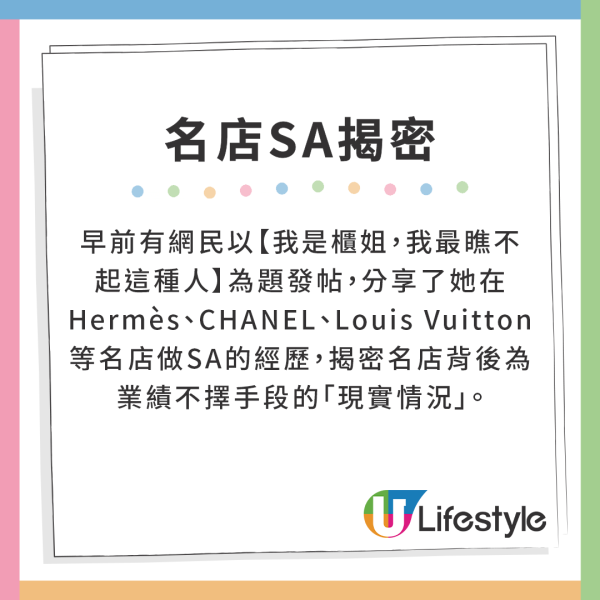 許多網民經常在匿名網站Dcard上分享自己的經歷。早前有網民以【我是櫃姐,我最瞧不起這種人】為題發帖,分享了她在這個行業工作時親眼看到的「現實情況」和這個行業里的「現實問題」。帖主介紹自己有過7-8年當名店SA的經歷,包括名店、化妝品櫃都做過,並解釋名店指的就是例如Hermès、CHANEL、Louis Vuitton等等。(文章由《Goody25》授權轉載)