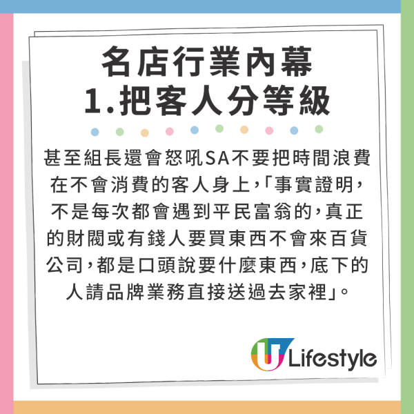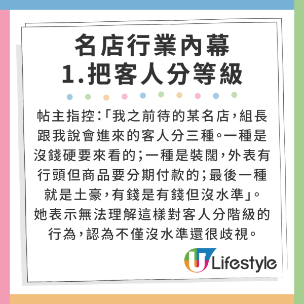 帖主細數在名店裡最常看到的幾個現象,包括組長會將進店的客人分類,以及部分Sales會因為接觸的客人消費能力比較好,「久而久之把自己歸類進上流圈,但實際上只是個Sales」。帖主在文中繼續道出名店背後的工作內幕,她表示無法理解組長這樣對客人分階級的行為,認為不僅沒水準還很歧視,畢竟只要走進店裡的客人就都有可能會消費。但後來她漸漸發現,「這或許就是精品櫃的生態圈吧」。