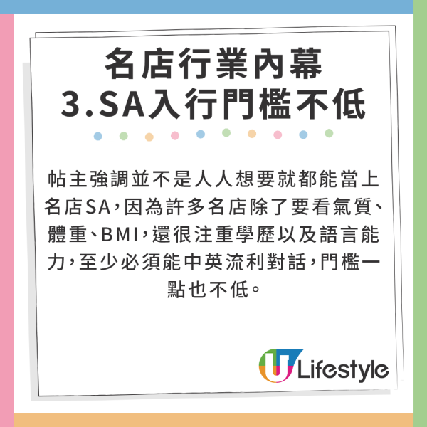 然而帖主的文章在分享出來後疑似遭到許多人抨擊,因此她隨後也二度更新解釋說:「大家好像誤會了什麼。」,同時還強調並不是人人想要就都能當上名店SA,門檻一點也不低。