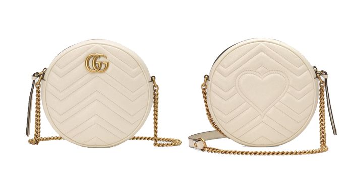 這個手袋袋身採用絎縫chevron皮革製作,經過復古效果處理,綴以品牌的雙G標誌,背面有心形圖案。