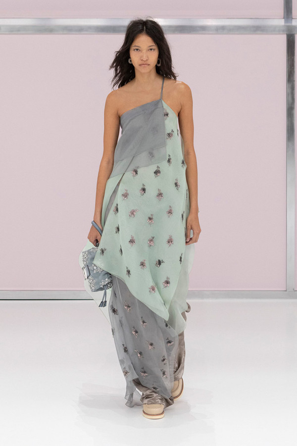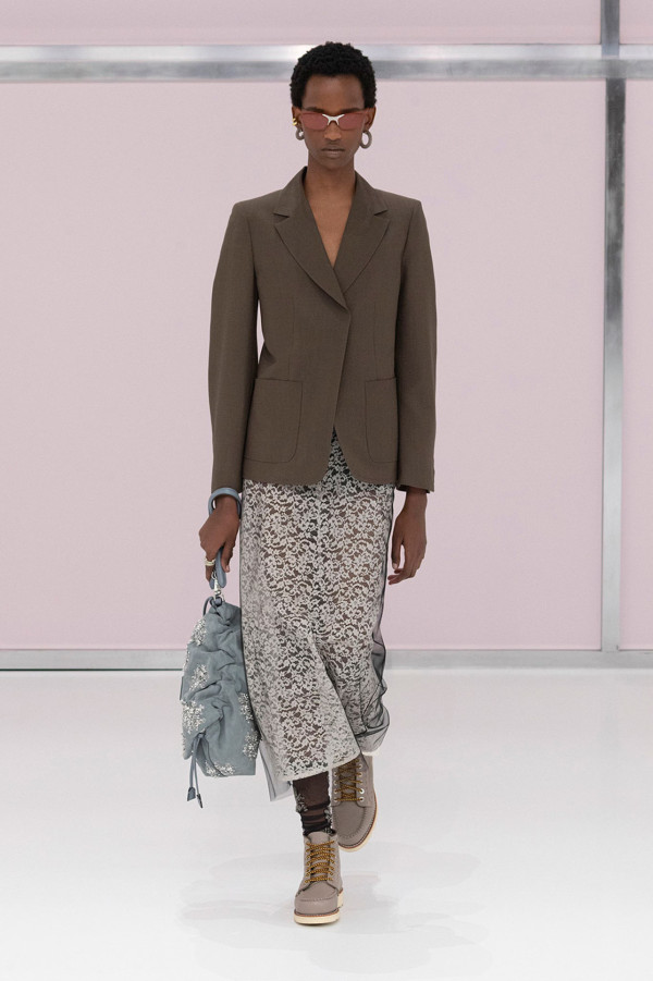 整體服飾設計上以裸色、大地色系為主調,再用上大量透視、薄紗、刺繡、針織等元素,特別一提的便是與Red Wing聯乘推出的鞋款,結合FENDI的配色、柔軟的Cuoio Romano皮革和Selleria手工縫線以及Red Wing經典Moc靴款,打造出設計感及質感兼備的鞋款。