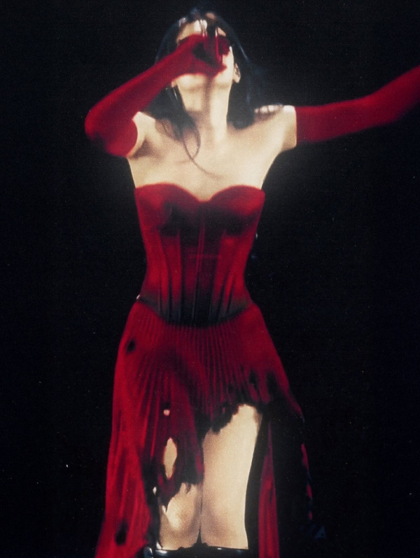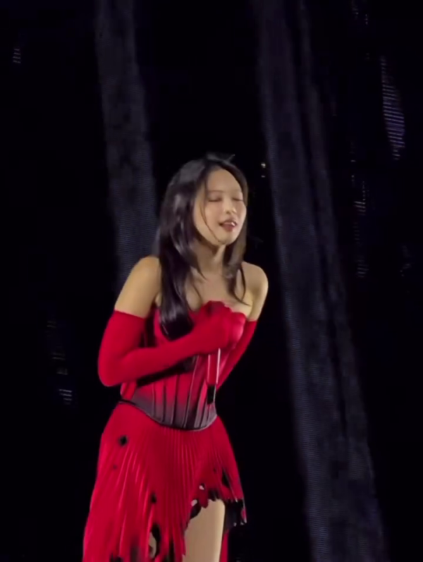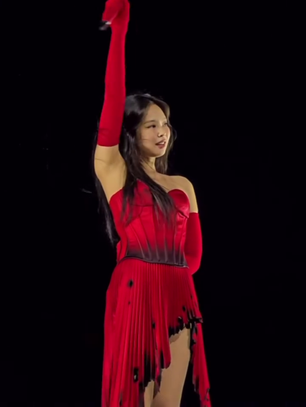 在當晚的舞台上,Jennie 身穿 Robert Wun 特別訂製的禮服驚艷亮相。上身是一件剪裁極致貼身的紅色緊身胸衣,完美勾勒出她標誌性的直角肩與纖細腰線,更展現出強烈的女性力量感。下身搭配的不對稱百褶短裙則是整體造型的靈魂所在,設計師運用極具辨識度的質感處理,讓裙擺邊緣呈現出破碎感,視覺衝擊力十足。