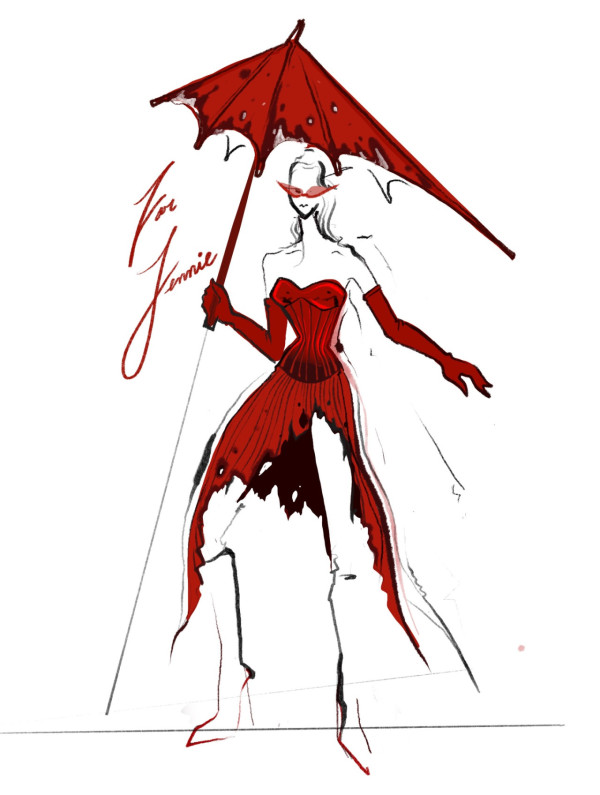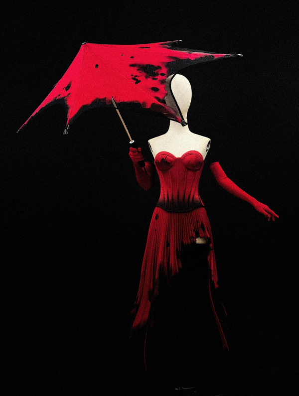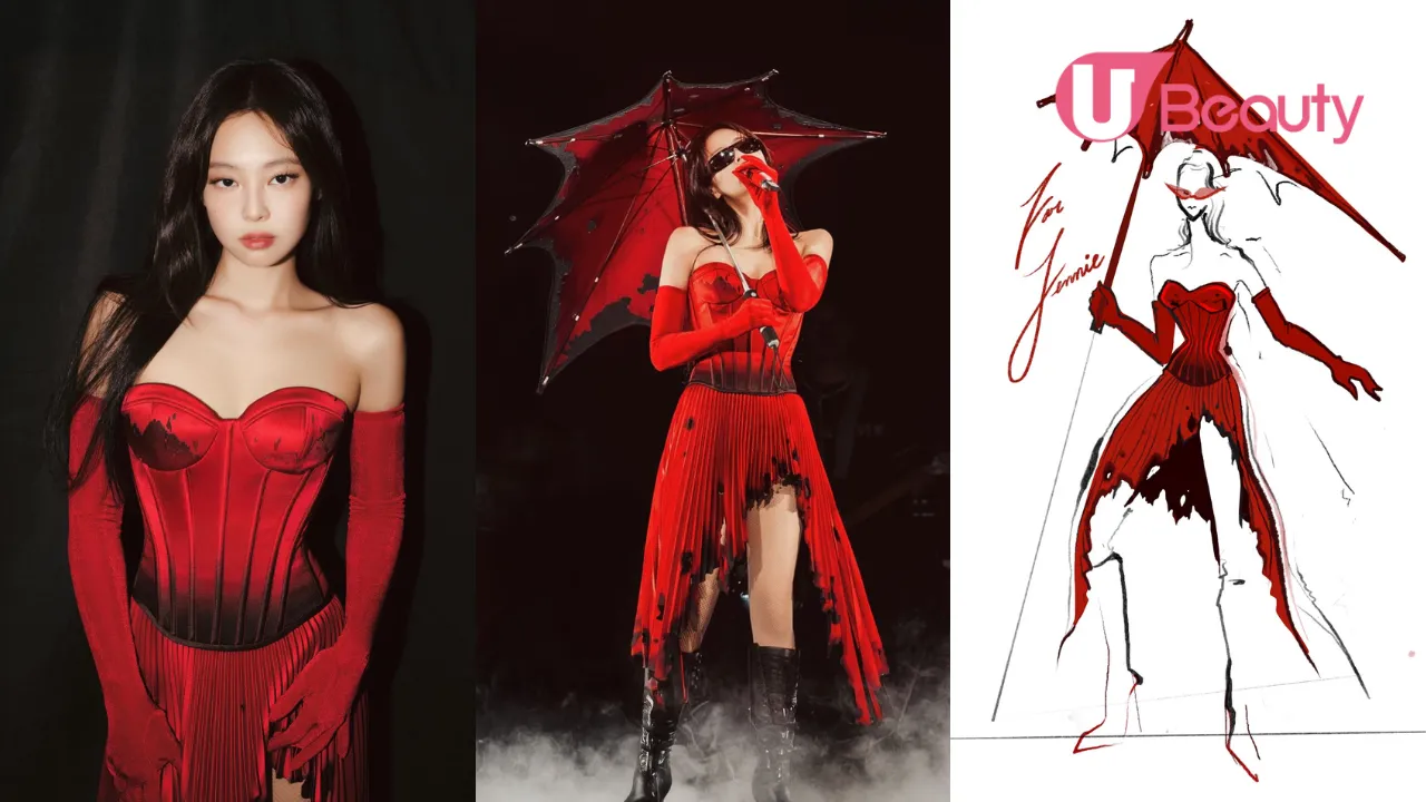 為了將這份「恐怖美學」推向極致,Jennie 手中更持有一把紅黑撞色的雕塑感雨傘,傘面同樣帶有熏黑細節。這把雨傘與服裝相互呼應,隨著舞蹈動作流轉,為舞台增添了一抹神秘而強烈的電影氛圍,讓 Jennie 彷彿如剛重生的鳳凰般奪目。