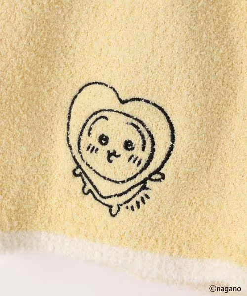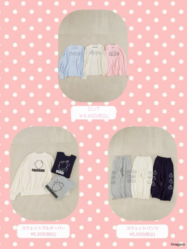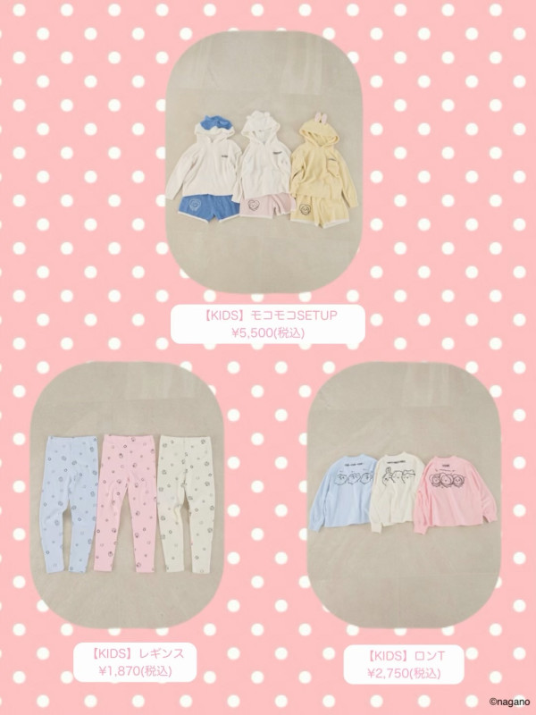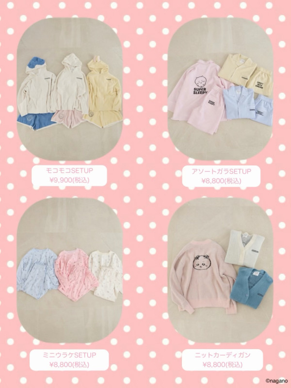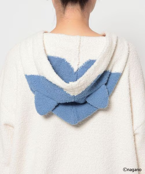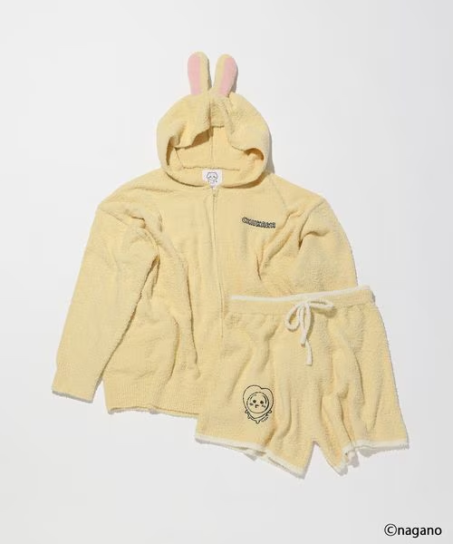 這次聯乘系列的重頭戲,絕對是這款 「毛絨絨居家服套裝(モコモコSETUP)」!這款居家服採用了輕盈柔軟的毛絨素材,觸感像雲朵般舒適,最適合在放鬆的居家時光穿著 。最令人心動的設計亮點在於 連帽處——設計師將 Chiikawa、Hachiware小八貓和 Usagi烏薩奇的標誌性耳朵立體還原在帽子上 !