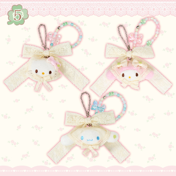 想要隨身攜帶這份可愛?這款吊飾將角色加入Kuromi、My Sweet Piano、Bonbonribbon 與Marron Cream,同樣配戴著蕾絲頭巾與蝴蝶結,手上還拿著象徵幸運的四葉草 ,一共有7個角色款式!