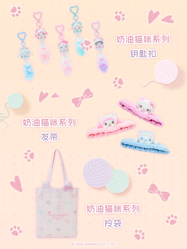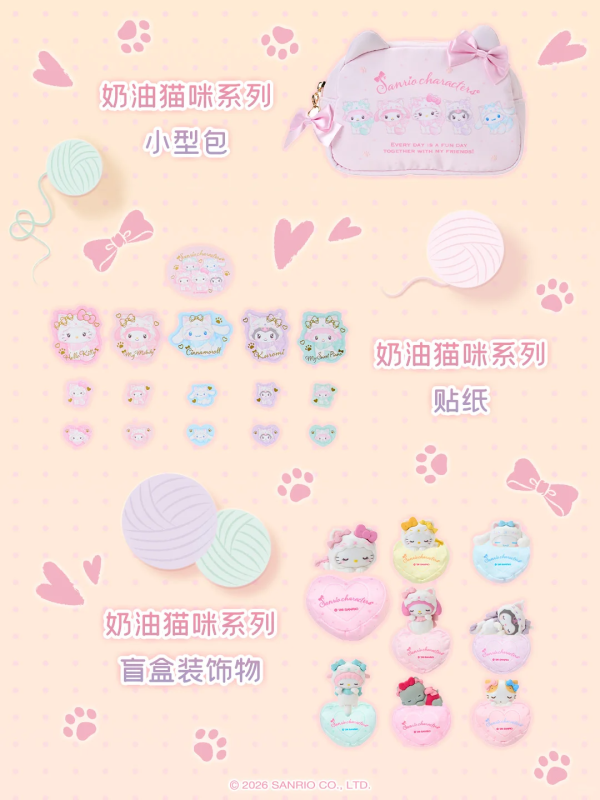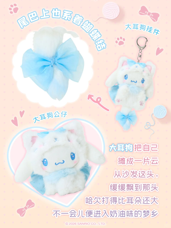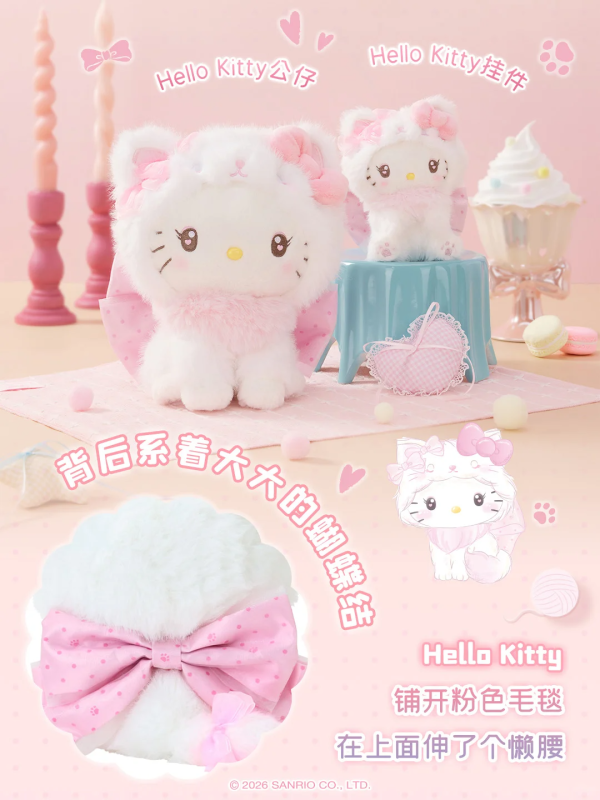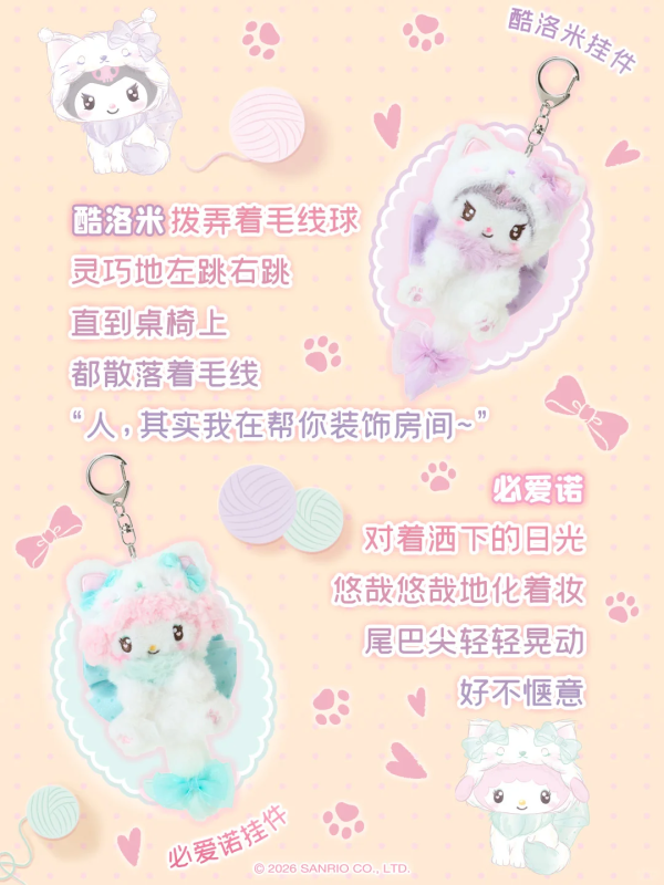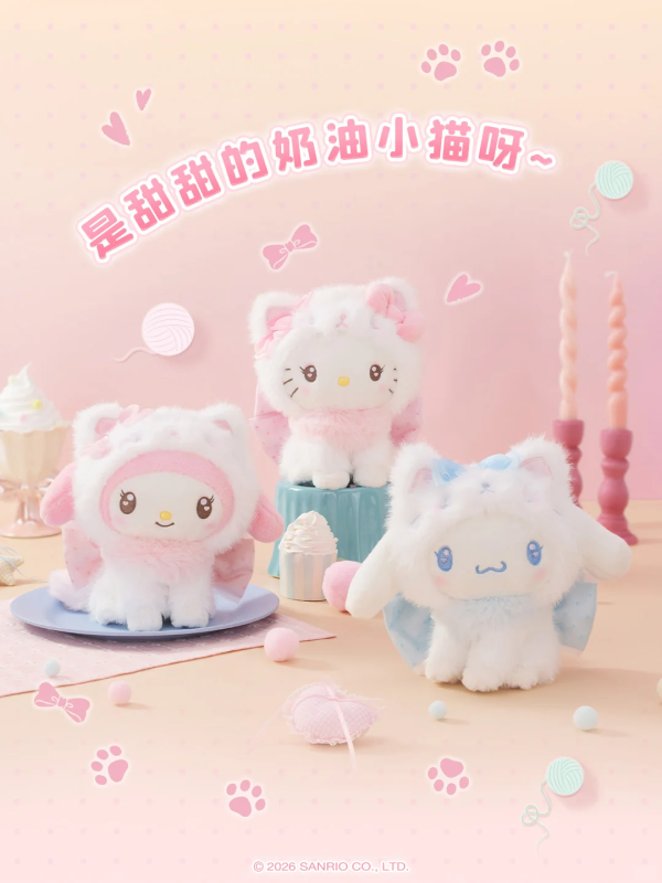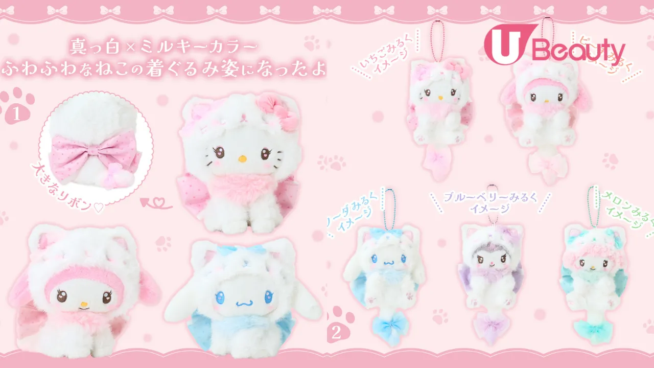 這款公仔最大的亮點就是「純白 x 牛奶色」的搭配。Hello Kitty、My Melody 和 Cinnamoroll 穿著毛茸茸的貓咪裝,呈現乖巧的坐姿 。轉過身還有驚喜!背面有波點或肉球圖案的大蝴蝶結,加上這系列獨有的純白毛流感,手感極佳 。(全3種)