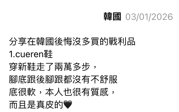 最近在 Threads 上,不少網民都對 CUEREN 的皮鞋讚不絕口,激讚其款式多又好穿。有網民誇張形容「穿新鞋走兩萬多步都不是問題」,腳板底與腳跟亦完全沒有出現刮腳或不適的狀況!更有網民分享,原本與家人打算「只看一眼」,結果一試穿便愛上,每人一口氣買了 2 到 3 雙皮鞋,舒適度令人驚艷! 除了被網民瘋狂力推外,早前由韓國人氣女星高允貞主演的熱播劇集《愛情怎麼翻譯》中,女主角同樣穿上 CUEREN 的長靴出鏡,讓品牌的人氣再度急升!