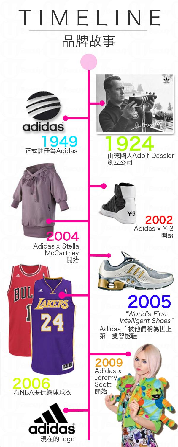 德國體育服裝品牌 adidas 始於1949年,以創辦人Adolf Adi Dassler命名,專門生產有個性的運動鞋。如今Adidas的產品全面、多元,為參與不同運動如籃球、足球、高爾夫球、跑步、網球等的人士提供一系列的裝備包括鞋類、服飾及配件。