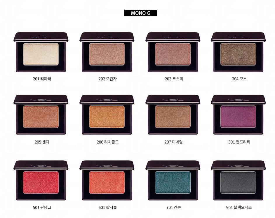 Mono G的“G”代表”Glitter”(閃爍),主要由大地色及一些特別的色調組成,如羅蘭紫、孔雀綠等。加上閃粉的眼影能夠大範圍地提亮整個眼部的輪廓,加強深邃感。