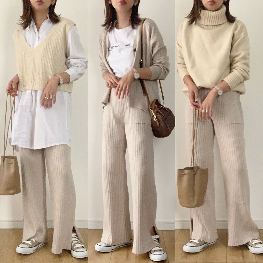 每天上班都在煩惱穿什麼?同色系的套裝絕對是懶人必備,像下圖中間的穿搭中,簡單配以一件白Tee,感覺已經十分亮眼。直紋的針織上衣、針織褲,感覺溫暖又柔和。若想增加層次感,可以加配一件白色長版襯衫,看起來更時髦!