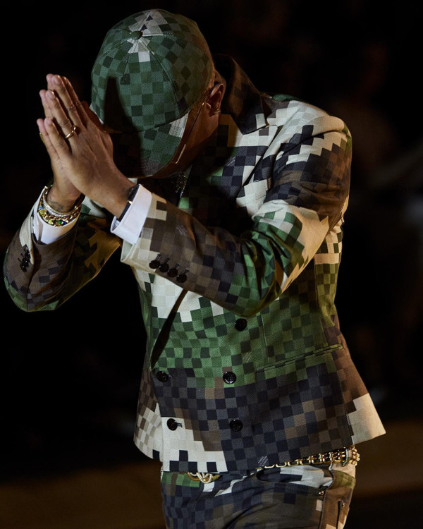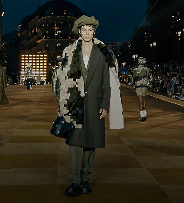 創新的像素化迷彩Monogram無疑是這次時裝騷的焦點,設計巧妙地融合了LV的經典Monogram和現代風格,讓人眼前一亮。這種名為「Damoflage」的像素化設計呈現在眾多單品之上,包括雨靴、大褸、西裝等,其中最為吸睛的便是以縷空方式呈現的像素化LV Monogram大褸,單品極具視覺層次和奢華質感。