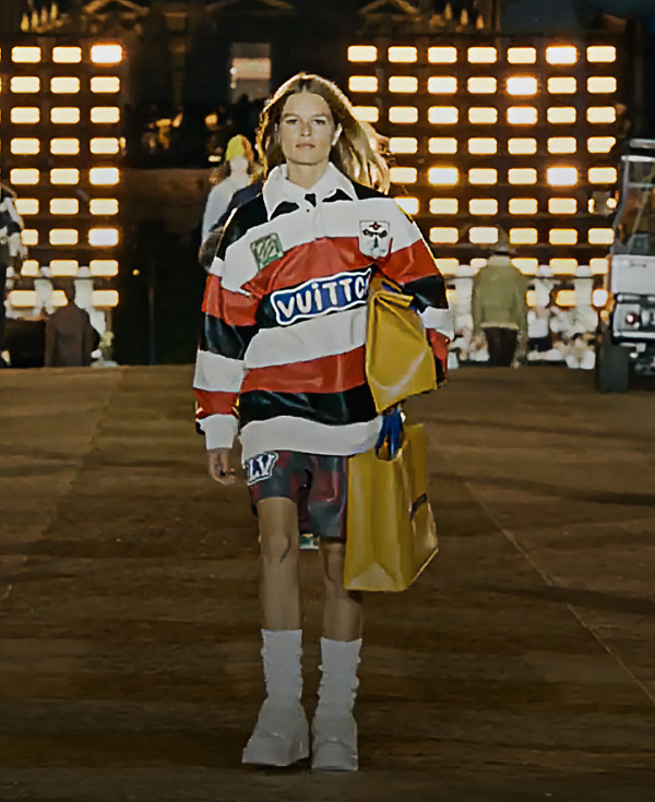 這場盛大的時裝秀選址於有着400多年歷史、經歷過二次大戰的新橋(Pont Neuf)。整座橋的地面都鋪滿品牌標誌性的黃色Damier棋盤格,橋的起點是兩道裝滿大型照明燈的高牆,為一眾模特兒在「西洋棋盤」上開闢出道路。
