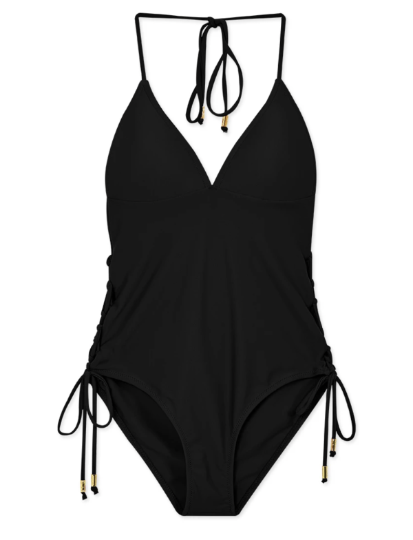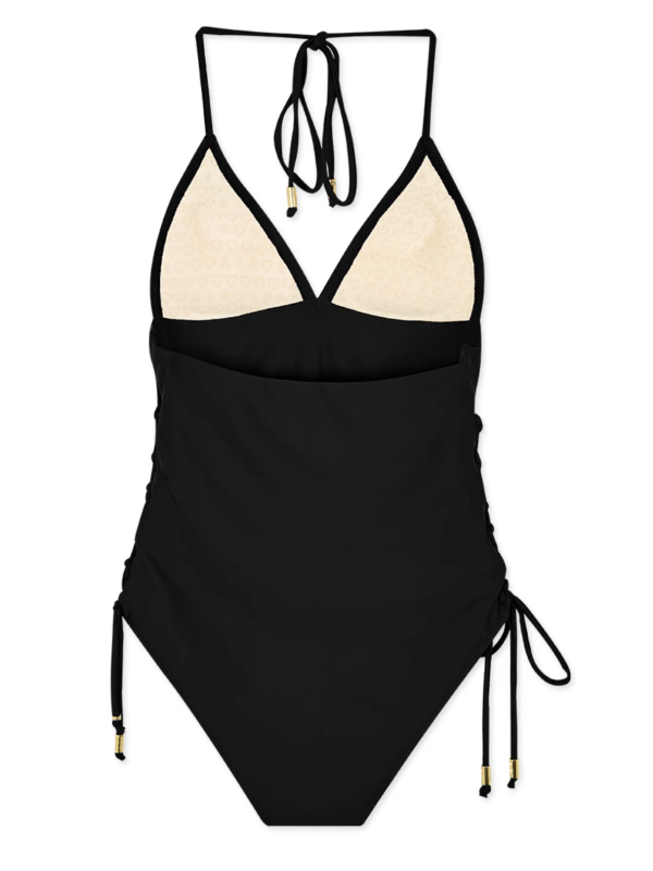 這款黑色色連身吊帶泳裝展現溫柔優雅氣質,低胸的設計突顯出性感魅力,而側面鏤空的綁帶細節則融入了時尚元素,挖空設計適合倒三角身材、蘋果型身材女生,營造出視覺層次和曲線美。黑色營造出簡約而柔和的視覺效果,融合性感與型格!