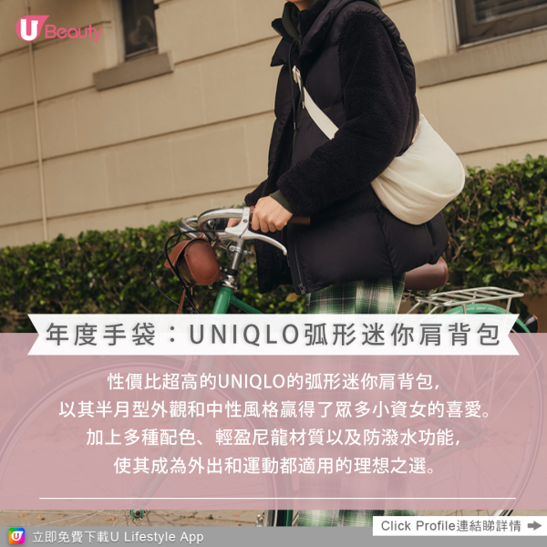 性價比超高的UNIQLO弧形迷你肩背包,成為Lyst最受歡迎的年度手袋。這款手袋以其半月型外觀和中性的設計風格贏得了眾多小資女的喜愛。加上多種配色、輕盈尼龍材質以及防潑水功能,使其成為外出和運動都適用的理想之選。