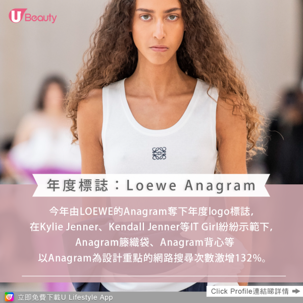 今年由LOEWE的Anagram奪下年度logo標誌,品牌創意總監Jonathan Anderson巧妙運用四方形圖案,讓Anagram成為品牌外套與包款的獨特設計元素。在Kylie Jenner、Kendall Jenner等IT Girl紛紛示範下,Anagram籐織袋、Anagram背心等以Anagram為設計重點的網路搜尋次數激增132%。