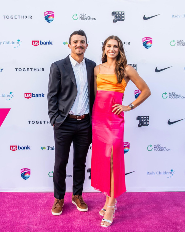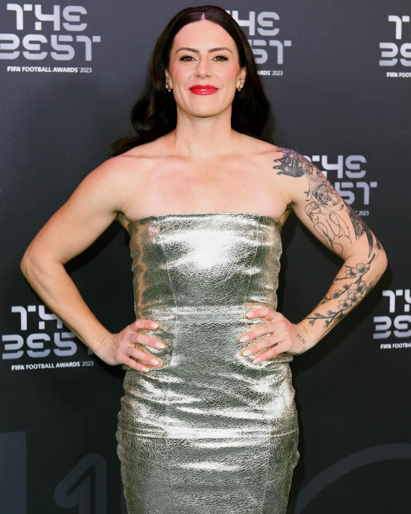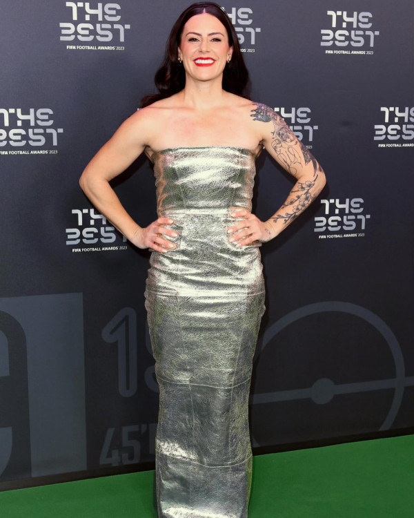 美國女子足球運動員Ali Krieger在2015年和2019年的國際足總女子世界盃均獲得冠軍,她在2024年FIFA年度頒獎典禮上,以金屬色露肩禮服亮相。之後又在2024 Vision Awards典禮上,穿上了超亮眼的粉紅微透視連身裙。
