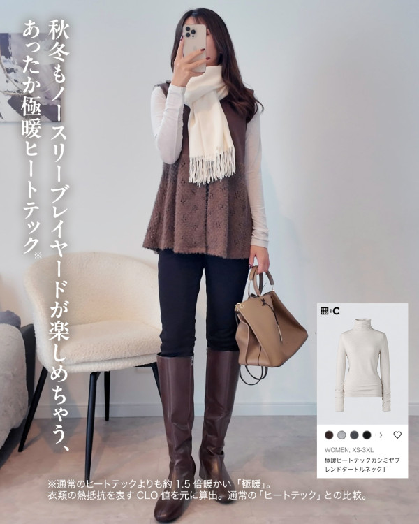 穿搭Tips: 這款絕對是「單穿」王者!因為版型好看,可直接當作一件貼身高領上衣,下身配搭一條闊腳褲或長裙,已經氣質滿滿。日本女生也喜歡把它疊穿在恤衫或連身裙內,保暖又有型,難怪會成為斷貨王!